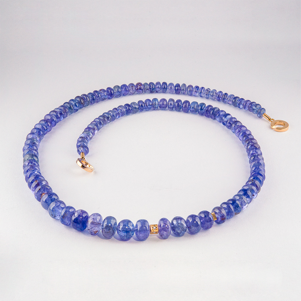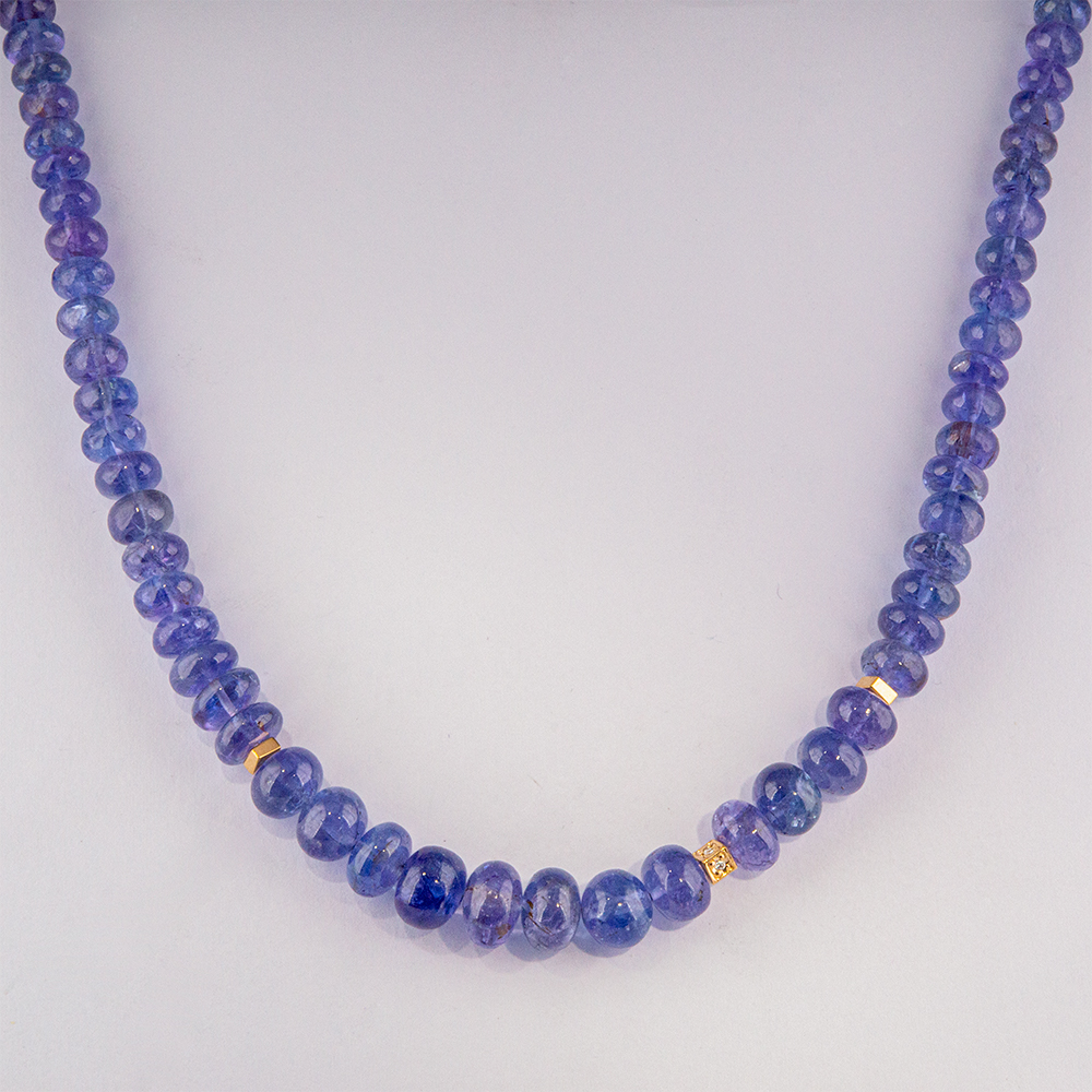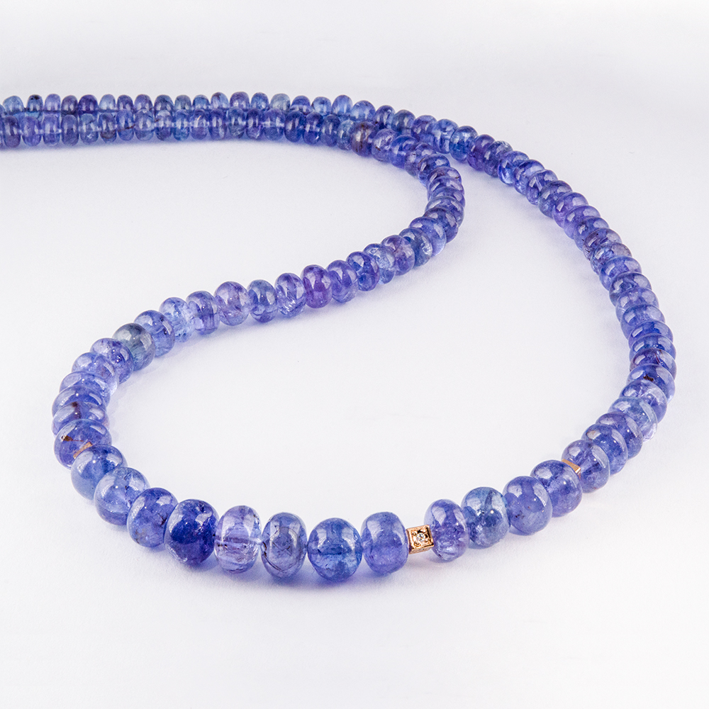 La Tanzanite est une pierre bleue-violette de la famille de la Zoïsite, découverte en 1967 dans les collines de Merelani en Tanzanie. Les 160 Carats de Tanzanite composant ce collier proviennent tous de cette unique zone de moins de 20 km² près du Kilimandjaro. Une pierre unique, fruit d'une anomalie géologique que l’on a jamais retrouvé ailleurs dans le monde et dont le gisement risque de s'éteindre prochainement.